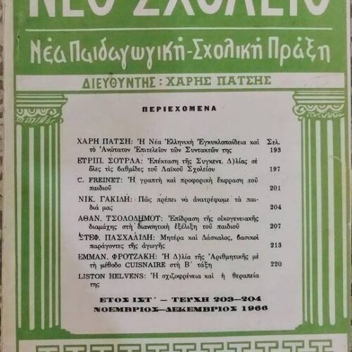 Διαβάστε περισσότεραΝέα Παιδαγωγική-Σχολική Πράξη Διευθυντής: Χάρης Πάτσης Άρχισε η έκδοσή του το 1950. Ο εκδότης Χάρης Πάτσης θέλησε να κάνει ένα περιοδικό επιστημονικό σύμβουλο της καθημερινής πράξης των δασκάλων. Να ενημερώνονται οι δάσκαλοι με τα επιτεύγματα των επιστημών της αγωγής. Με την επιβολή της δικτατορίας το 1967 σταμάτησε η έκδοσή του. Στο Μουσείο έχουμε 52 τεύχη από το 1952 μέχρι το 1960. Μας τα δώρισε η Νικολιά Μαρία.View product -