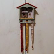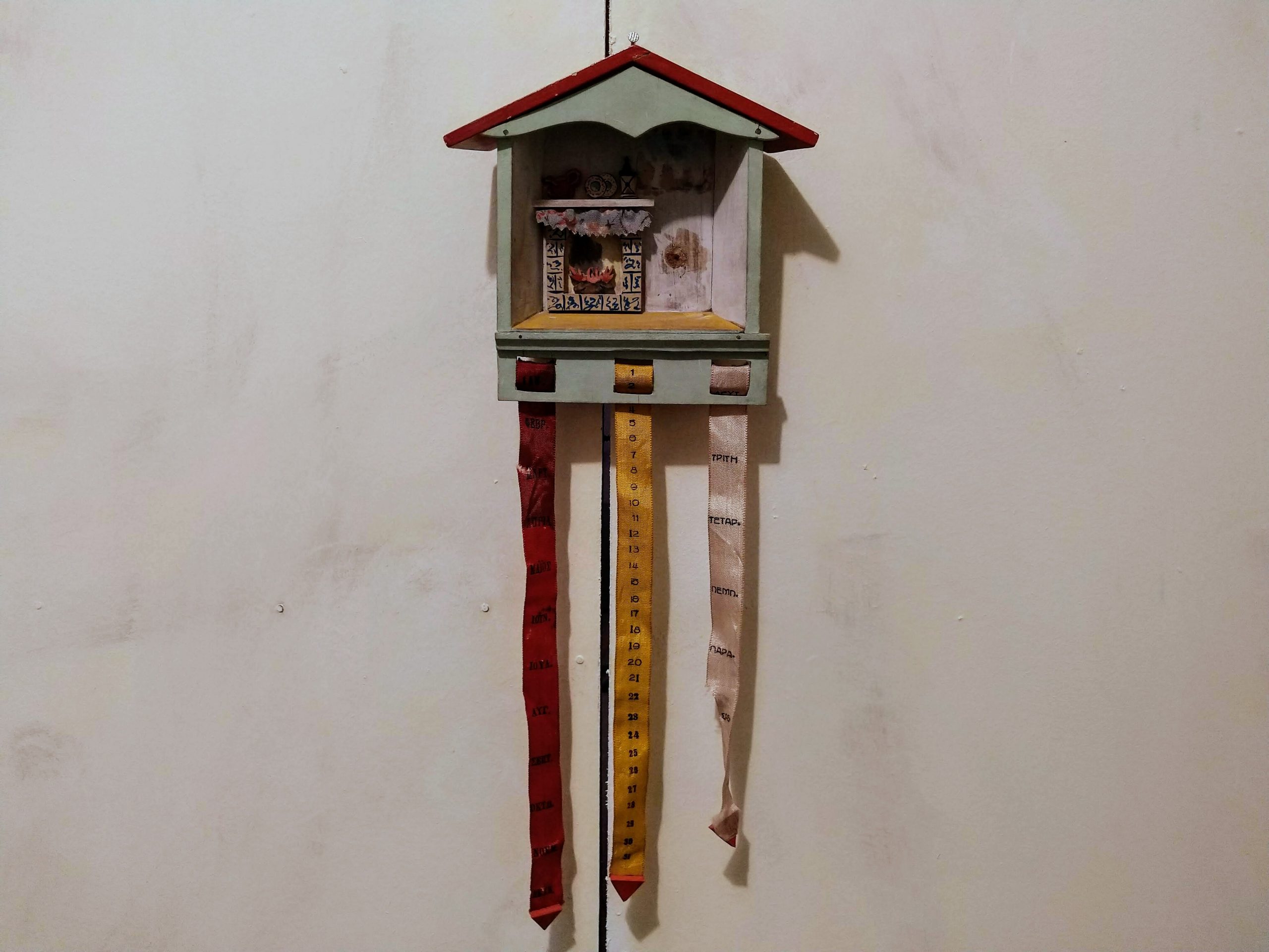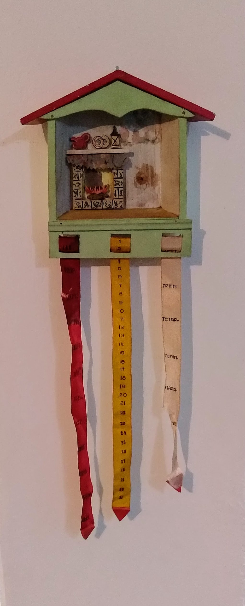 Χειροποίητο ξύλινο ημερολόγιο, αποτελείται από ένα ξύλινο κουτί που απεικονίζει ένα δωμάτιο σπιτιού και έχει τρεις πάνινες κορδέλες που περιστρέφονται γύρω από έναν άξονα. Στις κορδέλες είναι γραμμένες οι μέρες και οι μήνες του χρόνου. Περιστρέφοντας κατάλληλα τις κορδέλες έχουμε κάθε μέρα τη σωστή ημερομηνία.