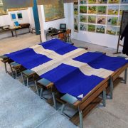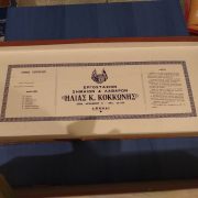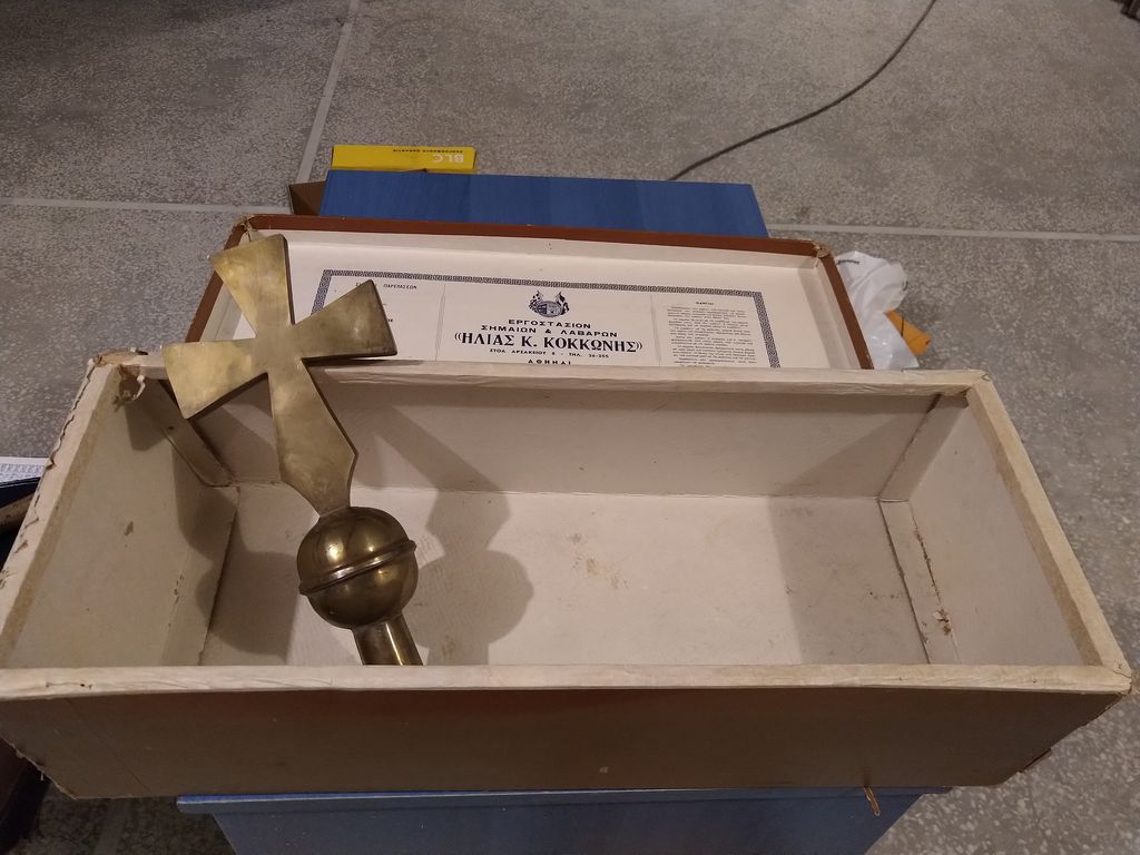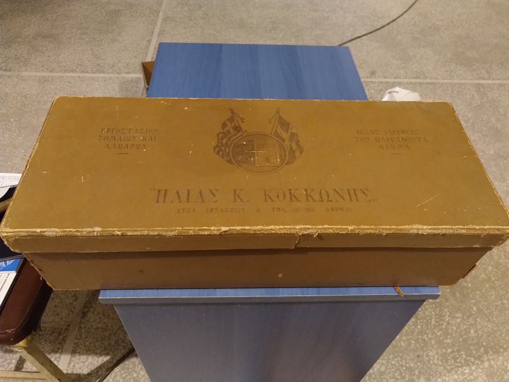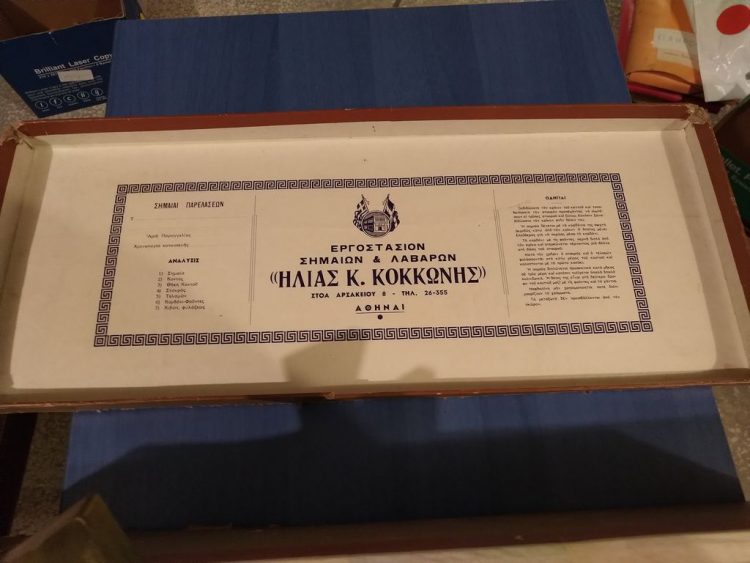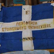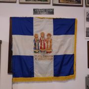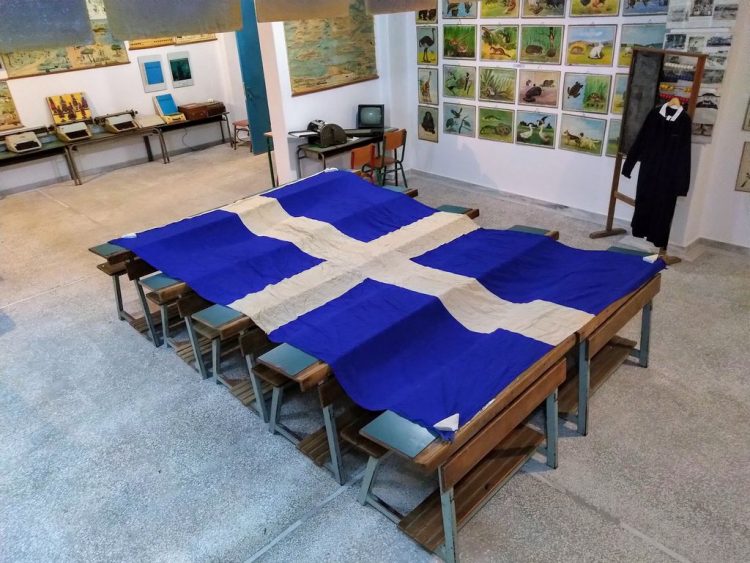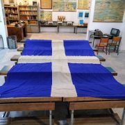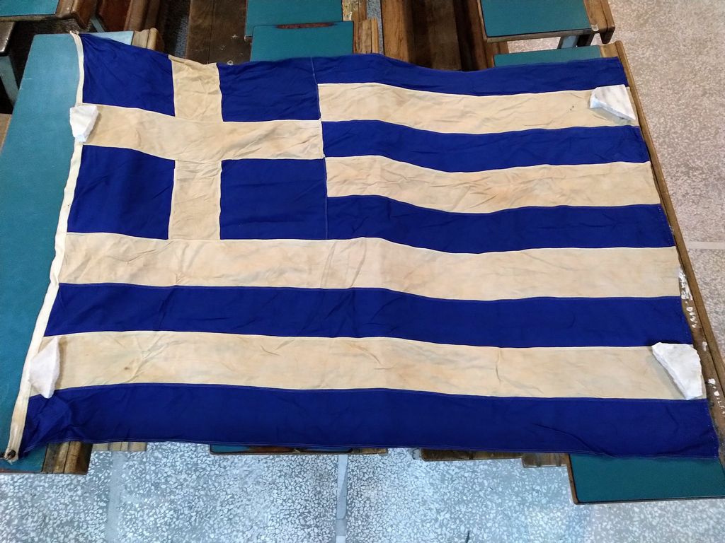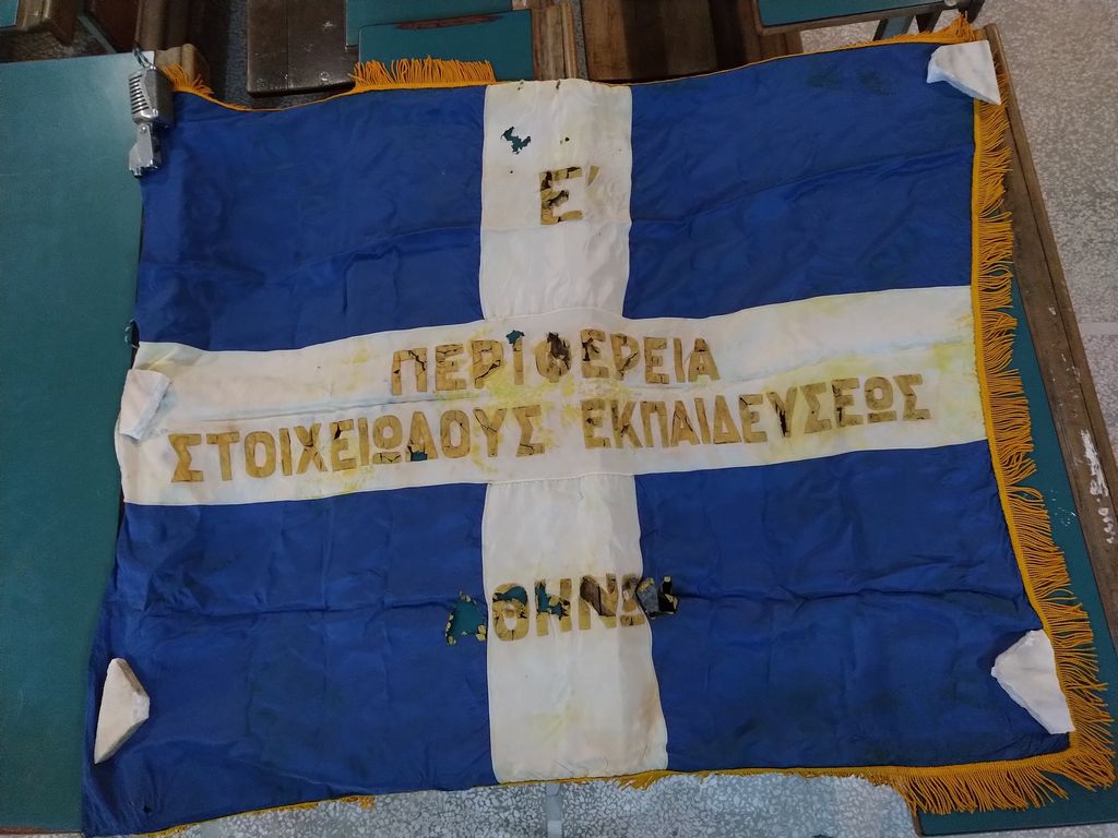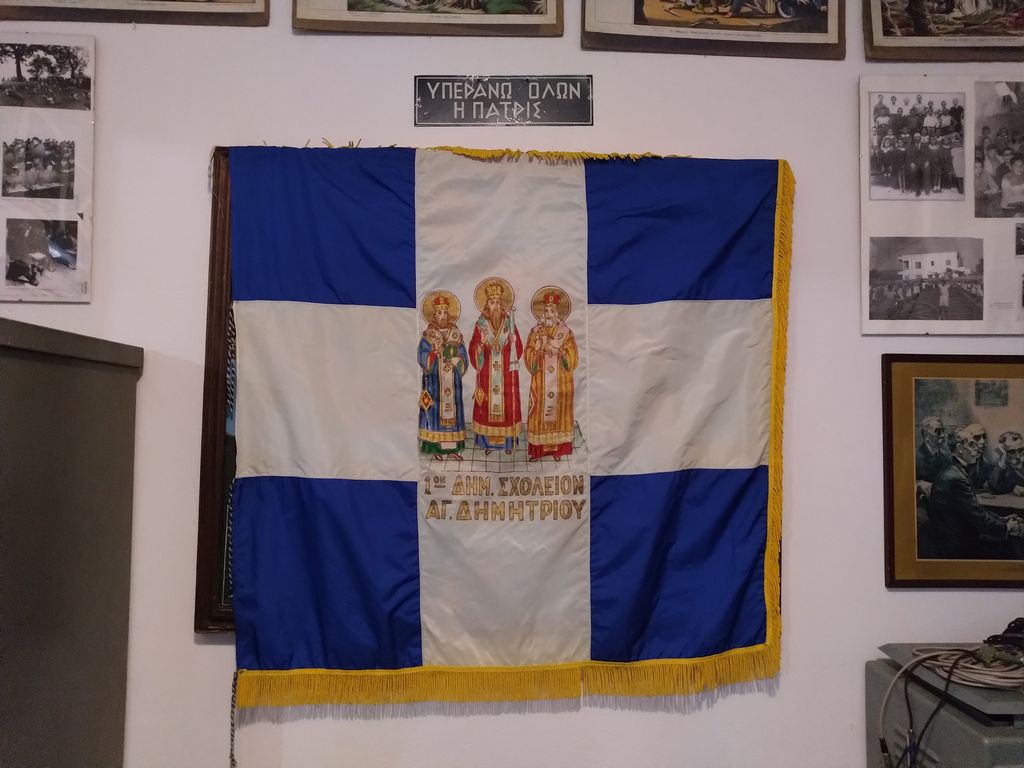 Στο Μουσείο μας έχουμε μια σημαία για τον εορτασμό των Τριών Ιεραρχών από το 1ο Δημοτικό Σχολείο Αγίου Δημητρίου, μια σημαία της Ε΄ Περιφέρειας Στοιχειώδους Εκπαιδεύσεως Αθηνών ( σε αυτήν ανήκε παλιότερα ο Άγιος Δημήτριος), μια μεγάλη που έχει μήκος 3,20 μ. και πλάτος 2,20μ. και άλλη μια μικρότερη που μάλλον ανήκαν και αυτές στο γραφείο εκπαίδευσης. Επίσης έχουμε ένα κουτί φύλαξης απ’ το οποίο φαίνεται το εργοστάσιο παραγωγής των σημαιών.