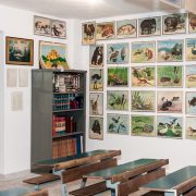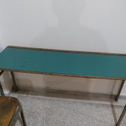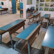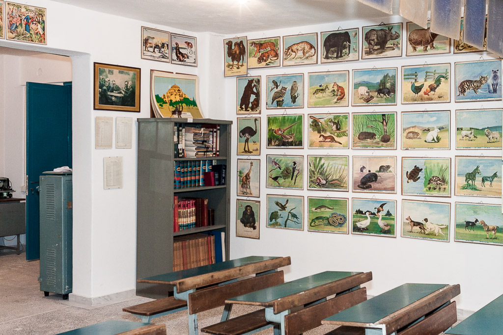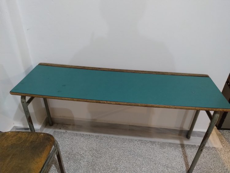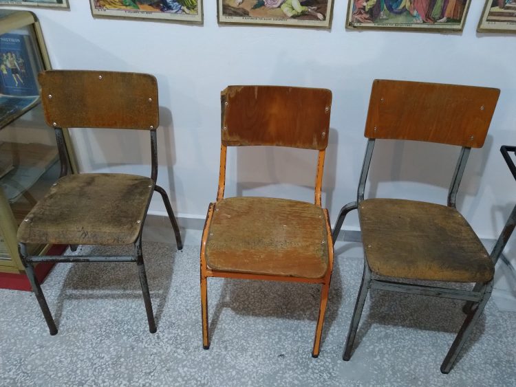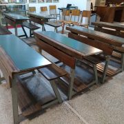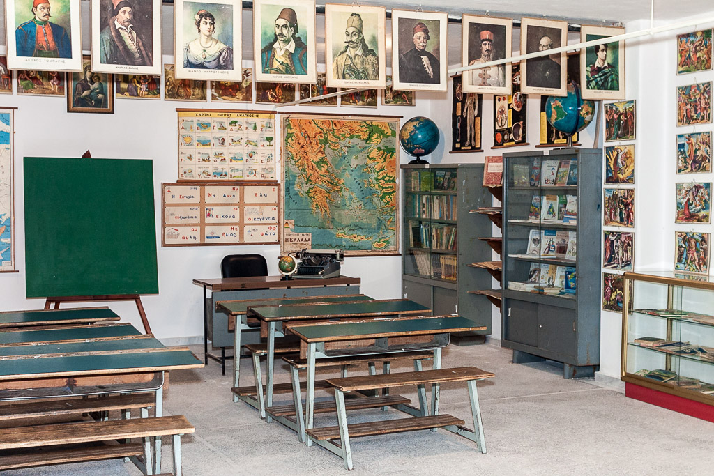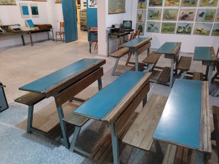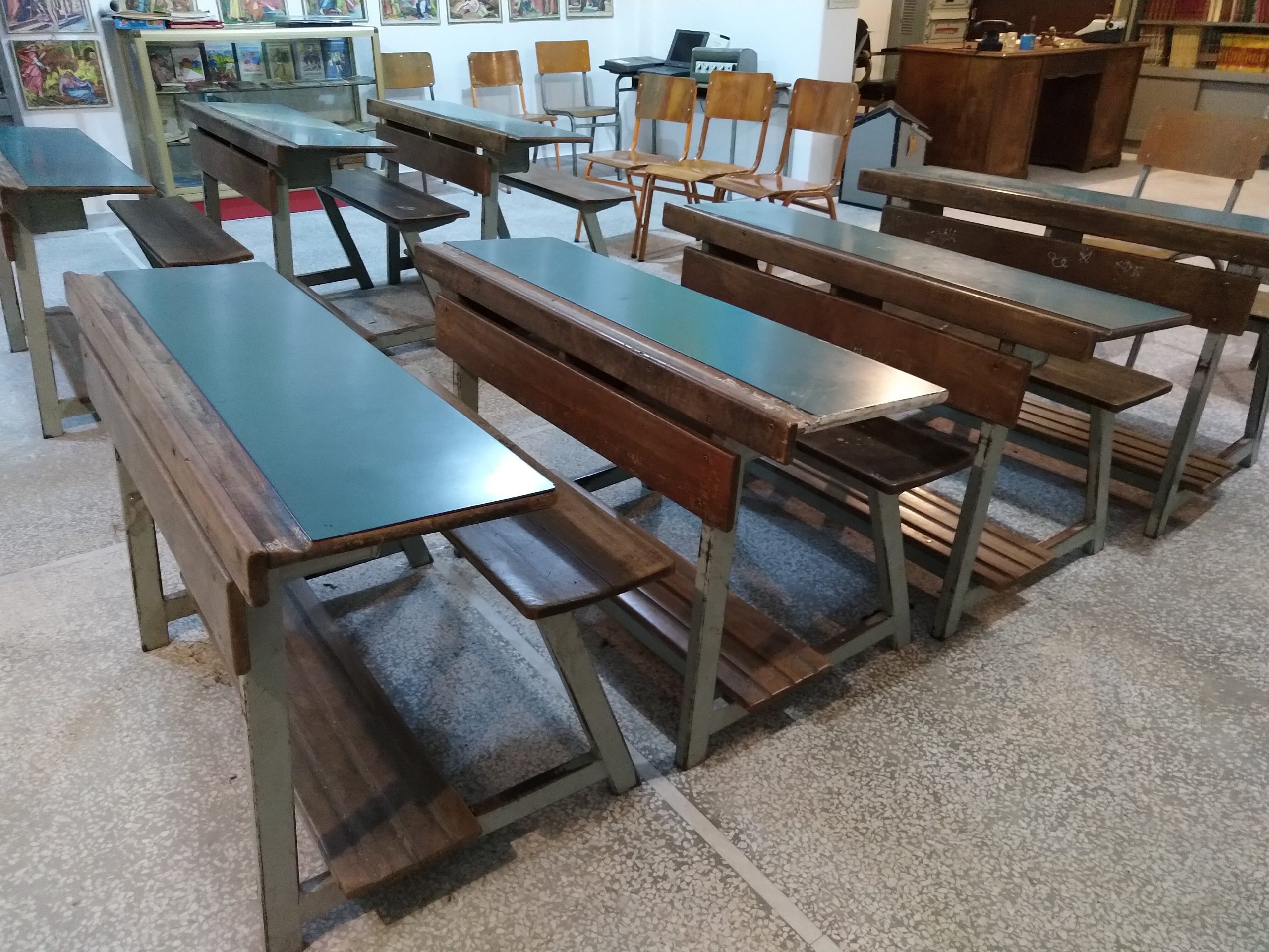Τα παλιά σχολικά θρανία ήταν ξύλινα και το κάθισμα ήταν ενσωματωμένο στο θρανίο. Στα μέσα της δεκαετίας του 60, με τον εκσυγχρονισμό της επίπλωσης τα θρανία αποκτούν μεταλλικό σκελετό. Στη συνέχεια αλλάζει ο σχεδιασμός και η εργονομία τους. Οι αλλαγές προχωρούν σταδιακά και φτάνουμε σιγά σιγά σε ένα απλό τραπέζι με καρέκλες. Τα θρανία που έχουμε στο Μουσείο είναι 10 με μεταλλικό σκελετό και ενσωματωμένο κάθισμα. Τα 7 μας τα έδωσε το 8ο Δημ. Σχ. Αγίου Δημητρίου και τα 3 το 11ο Δημοτικό. Επίσης άλλα 11 της δεκαετίας του 70 από το 1ο και το 10ο Δημ. Σχ. Αγ. Δημητρίου.