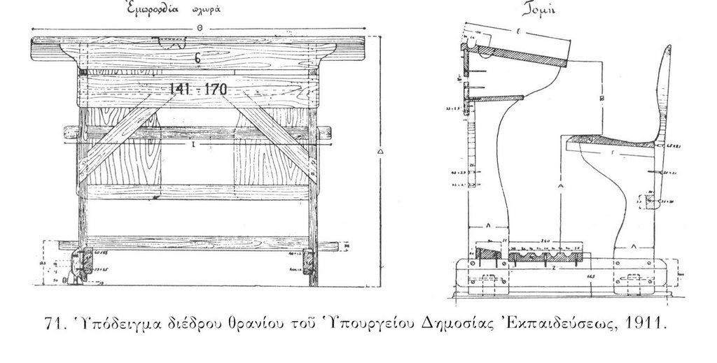 Το Ελληνικό κράτος , από το 1830 με το Εγχειρίδιο για τα αλληλοδιδακτικά σχολεία του Ι. Π. Κοκκώνη που γράφτηκε στην Αίγινα και με διάφορα άλλα Διατάγματα και κανονιστικά κείμενα, περιέγραψε με κάθε λεπτομέρεια τις προδιαγραφές του εξοπλισμού. Από τότε τα καθίσματα των μαθητών ονομάζονται θρανία. Οι ακριβείς διαστάσεις καθορίζονται στη βάση ανθρωπομετρικών δεδομένων. Στο σχήμα που ακολουθεί βλέπουμε ένα υπόδειγμα θρανίου του Υπουργείου Δημοσίας Εκπαιδεύσεως το 1911*.