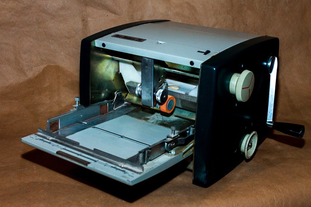 Περιγραφή: Μηχάνημα, που χρησιμοποιούσαν στο παρελθόν για την εκτύπωση εγκυκλίων, εργασιών σε περιορισμένο αριθμό αντιτύπων.