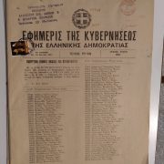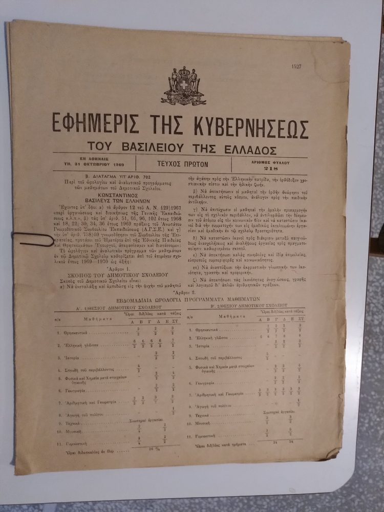 • Μία εφημερίδα με ημερομηνία 31 Οκτωβρίου 1969 και περιέχει Βασιλικό Διάταγμα για το Ωρολόγιο και Αναλυτικό Πρόγραμμα.