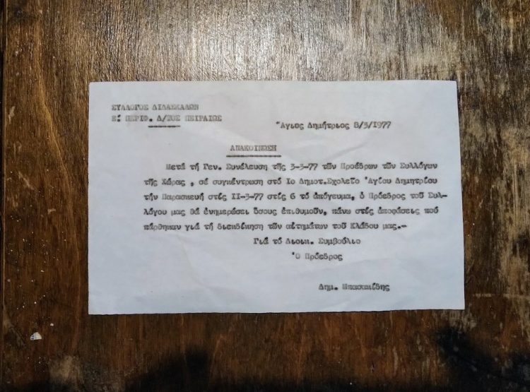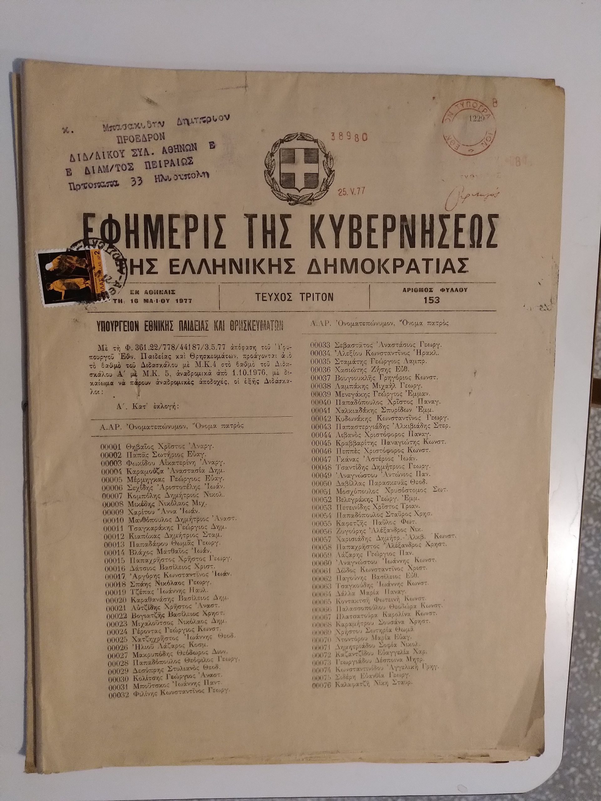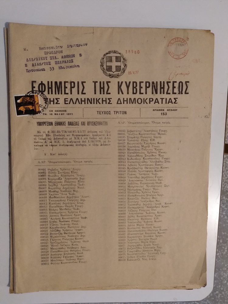• Μία εφημερίδα κυβερνήσεως με ημερομηνία 10 Μαΐου 1977 και περιέχει προαγωγές δασκάλων.