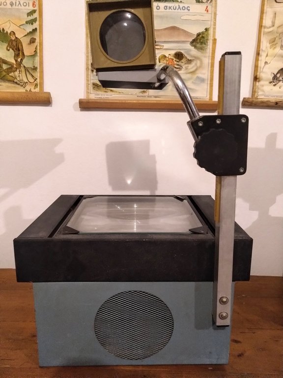 Περιγραφή: Προβολέας που χρησιμοποιείται για την παρουσίαση εικόνων και αντικειμένων σε οθόνη. Το προς προβολή υλικό τοποθετείται πάνω σε οριζόντια διαφανή επιφάνεια εργασίας.