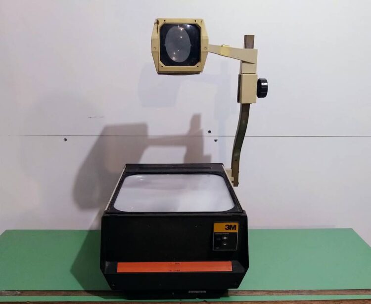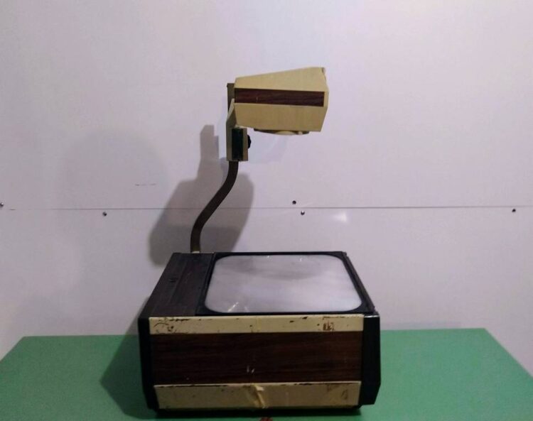 Περιγραφή: Προβολέας που χρησιμοποιείται για την παρουσίαση εικόνων και αντικειμένων σε οθόνη. Το προς προβολή υλικό τοποθετείται πάνω σε οριζόντια διαφανή επιφάνεια εργασίας.