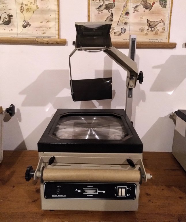 Περιγραφή: Προβολέας που χρησιμοποιείται για την παρουσίαση εικόνων και αντικειμένων σε οθόνη. Το προς προβολή υλικό τοποθετείται πάνω σε οριζόντια διαφανή επιφάνεια εργασίας.