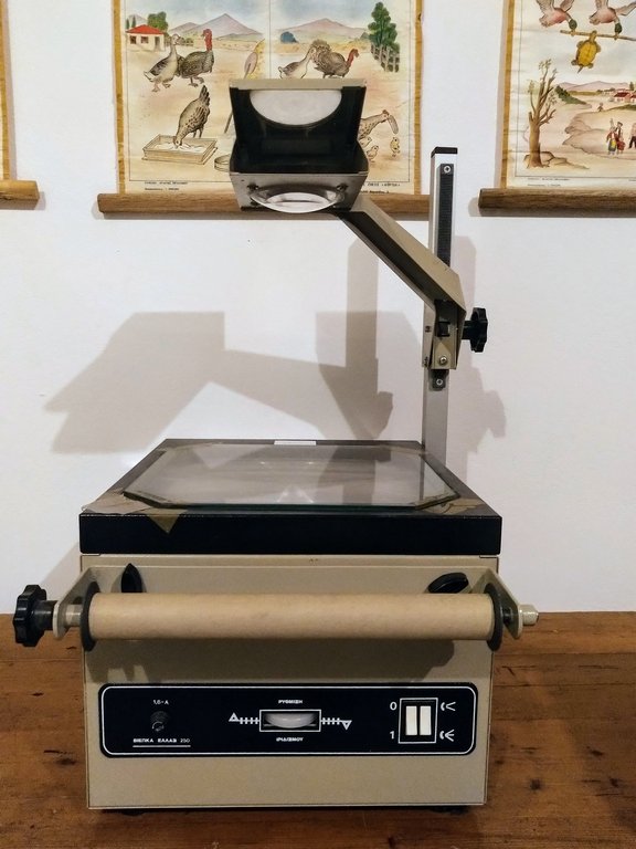 Περιγραφή: Προβολέας που χρησιμοποιείται για την παρουσίαση εικόνων και αντικειμένων σε οθόνη. Το προς προβολή υλικό τοποθετείται πάνω σε οριζόντια διαφανή επιφάνεια εργασίας.