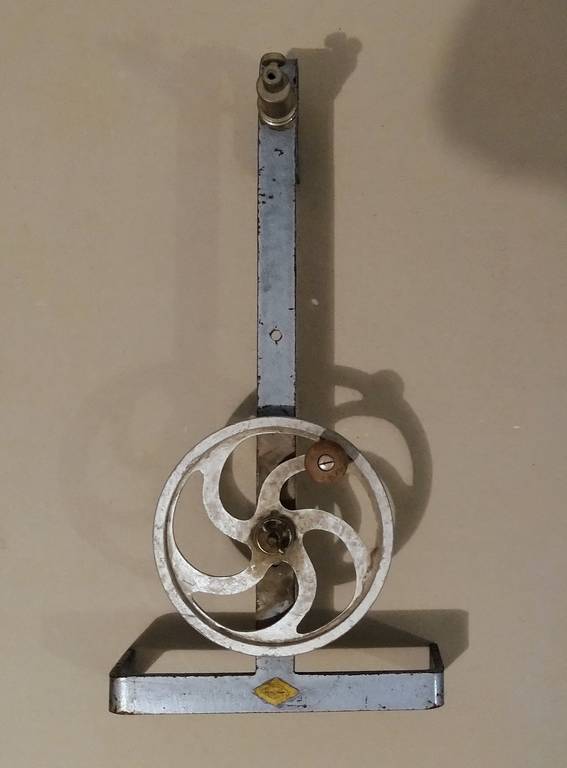 Αποτελεί σύστημα τροχαλιών το οποίο παρέχει περιστροφική κίνηση σε σειρά εξαρτημάτων για τη μελέτη της φυγόκεντρου δύναμης. Στην πιο συνήθη μορφή αποτελείται από δύο τροχαλίες που έχουν τη δυνατότητα να περιστρέφονται με πολύ μικρές τριβές σε σταθερή οριζόντια ή κατακόρυφη βάση. Η μεγάλη τροχαλία, διαμέτρου περίπου 20 cm, διαθέτει χειρολαβή περιστροφής και περιφερειακή αύλακα μέσα στην οποία διέρχεται ανθεκτικός ατέρμονας ιμάντας από πολυουρεθάνη ή άλλο αντίστοιχο ανθεκτικό υλικό. Ο ιμάντας μεταδίδει την περιστροφή στη μικρή τροχαλία διαμέτρου 25 – 30 mm, η οποία διαθέτει αξονική οπή διαμέτρου 8 mm με σφιγκτήρα τύπου πεταλούδας, για την προσαρμογή των εξαρτημάτων. νΗ μηχανή διαθέτει επίσης σύστημα σύσφιξης του ιμάντα, σημεία Λίπανσης των κινητών μερών καθώς και εφεδρικούς ιμάντες. Ανάλογα με την ταχύτητα χειροκίνητης περιστροφής και το λόγο πολλαπλασιασμού των στροφών, η φυγοκεντρική μηχανή μπορεί να αναπτύξει γωνιακή ταχύτητα έως και 2000 c/min. Μας την παραχώρησε το 5ο Δημοτικό Σχολείο Αγίου Δημητρίου.