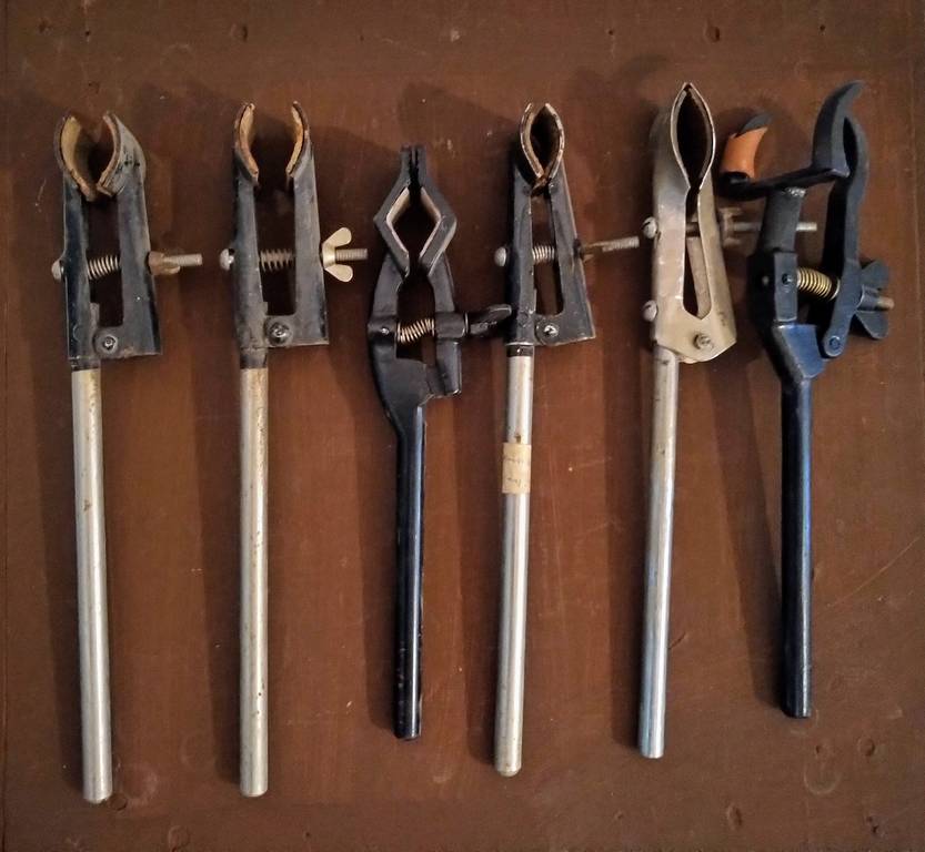 Λαβίδα με άνοιγμα σιαγόνων 20 – 60 mm, κατάλληλη για τη συγκράτηση ελαφρών αντικειμένων ή δοκιμαστικών σωλήνων. Το σφίξιμο ρυθμίζεται με σύστημα ελατηρίου – κοχλία με πεταλούδα. Οι δύο σιαγόνες της λαβίδας είναι από σκληρό άθραυστο μέταλλο και έχουν εσωτερική επένδυση από φελλό ή Λάστιχο, το οποίο μπορεί να αντικατασταθεί, εάν φθαρεί. Η λαβίδα καταλήγει σε μεταλλική ράβδο στήριξης διαμέτρου 10 mm και μήκους περίπου 15 cm για την προσαρμογή της σε σύνδεσμο. Μας την παραχώρησε το 5ο Δημοτικό Σχολείο Αγίου Δημητρίου.
