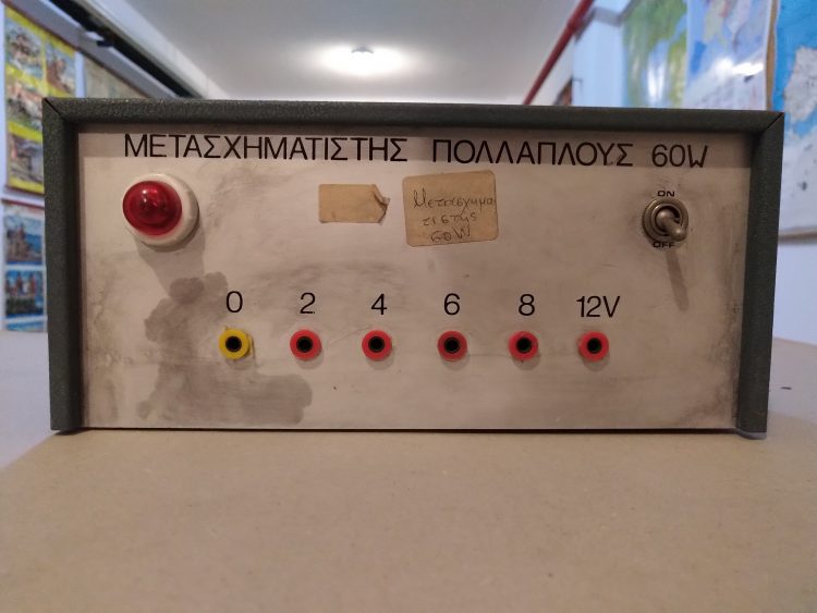 Περιγραφή: Πολλαπλός μετασχηματιστής ισχύος περίπου 60 – 100 W, με πρωτεύον 220 V και δευτερεύον που παρέχει εναλλασσόμενες τάσεις 0 – 2 – 4 – 6 – 8 – 12V.